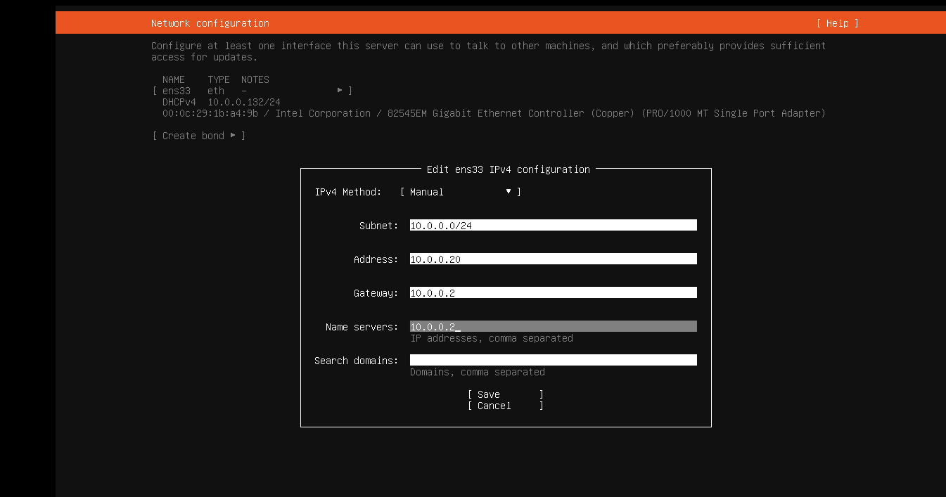 这里设定10.0.0.0/24网段,IP为10.0.0.20,网关和DNS都是10.0.0.2