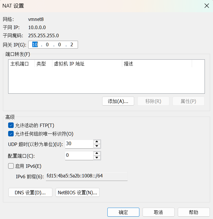 选择NAT模式,10.0.0.0网段