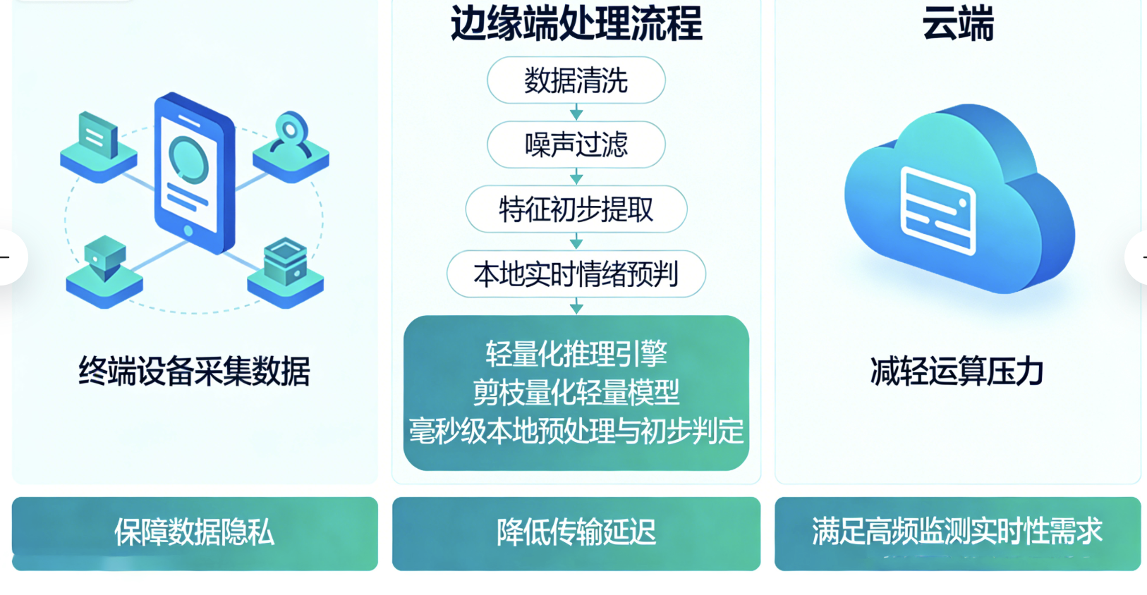 承接终端采集的原始数据,完成数据清洗、噪声过滤、特征初步提取,减轻云端运算压力,同时实现本地实时情绪预判,保障数据隐私,降低传输延迟,满足高频监测的实时性需求。边缘端采用轻量化推理引擎,搭载剪枝、量化后的轻量模型,实现毫秒级本地预处理与初步判定。
