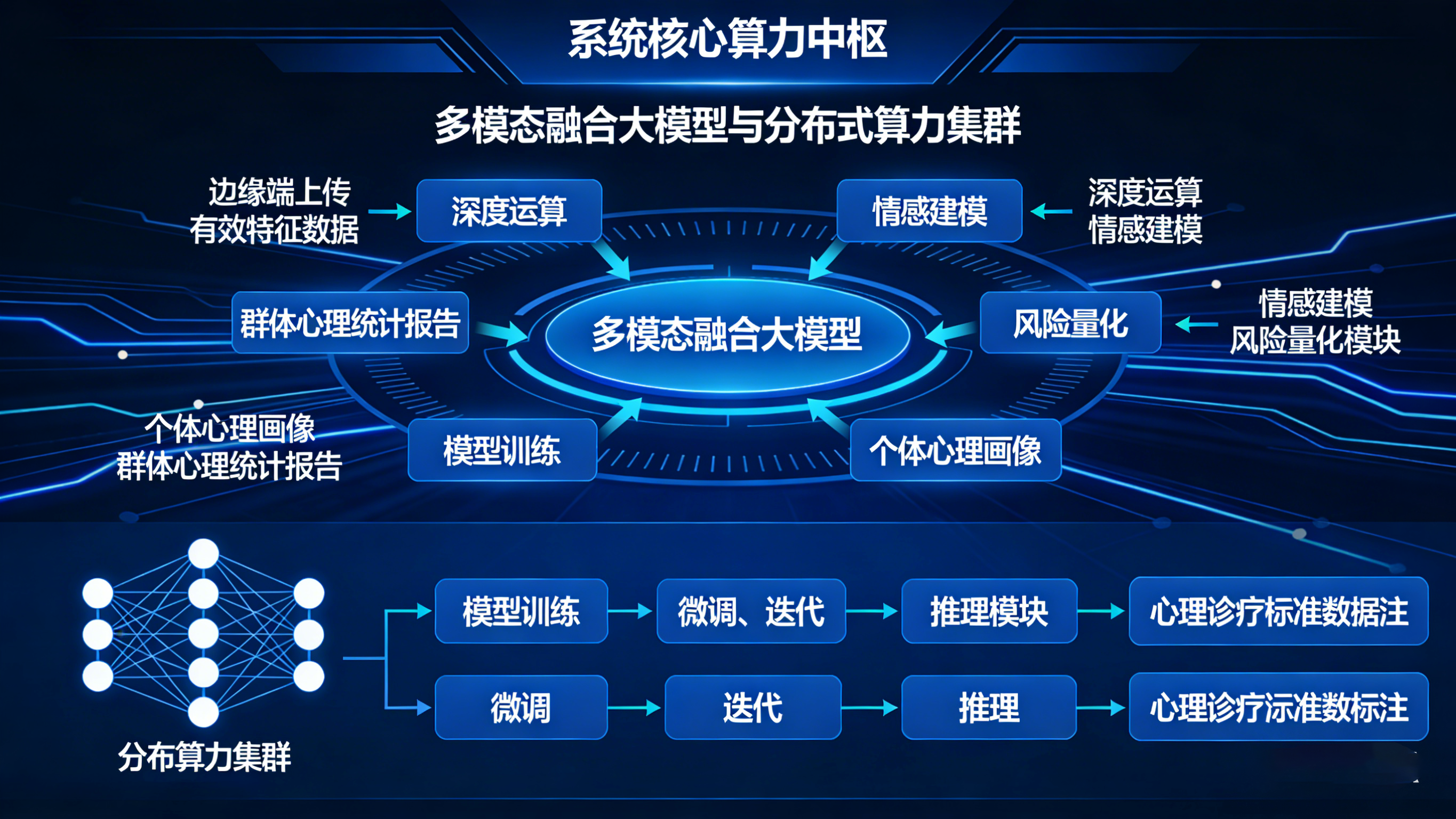 汇聚边缘端上传的有效特征数据,通过多模态融合大模型进行深度运算、情感建模、风险量化,生成个体心理画像、群体心理统计报告,是整个系统的核心算力中枢。依托分布式算力集群,完成模型训练、微调、迭代与推理,结合心理诊疗标准数据做标注,提升评估专业性。