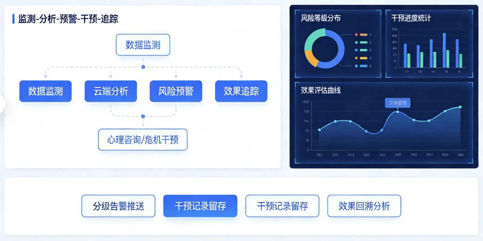 基于云端分析结果,分级触发风险预警,推送预警详情与处置建议,联动心理咨询、危机干预等流程,形成“监测-分析-预警-干预-追踪”的完整闭环。支持可视化数据看板、分级告警推送、干预记录留存、效果回溯分析,贴合实际管理需求。