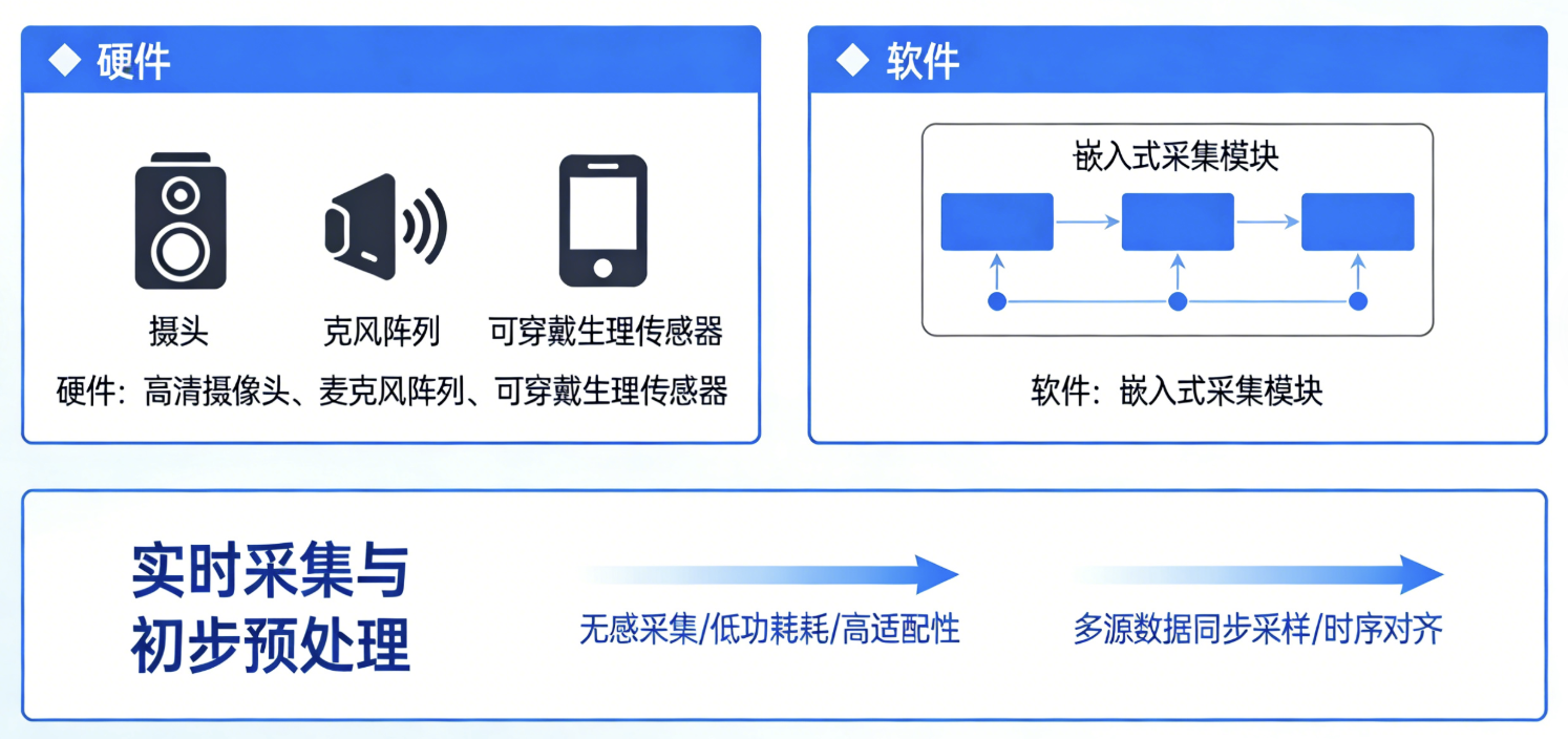 作为系统的数据入口,该层负责各类模态数据的实时采集与初步预处理,兼顾无感采集、低功耗、高适配性,避免给监测对象带来心理压力,保障数据的真实性。硬件层面搭载高清摄像头、麦克风阵列、可穿戴生理传感器,软件层面适配嵌入式采集模块,实现多源数据同步采样、时序对齐,杜绝数据错位。