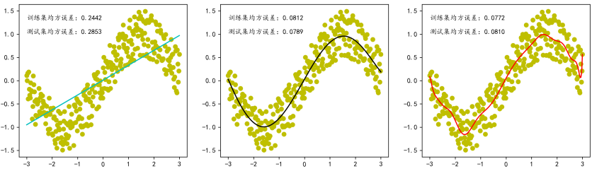 当使用1次多项式(一条直线)拟合时,模型欠拟合,训练和测试误差都很大。使用5次多项式拟合时,模型恰到好处,训练和测试误差都较小。使用20次多项式拟合时,模型过拟合,训练误差极低但测试误差反而升高。