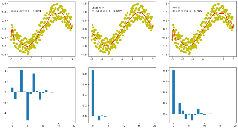 观察学到的20个系数:普通线性回归的系数很大且杂乱;Lasso回归的许多系数变成了0;Ridge回归的系数整体变小了但都不为0。正则化系数λ是一个超参数,需要在训练前设定,较大的λ会强制模型更简单,较小的λ则更灵活。