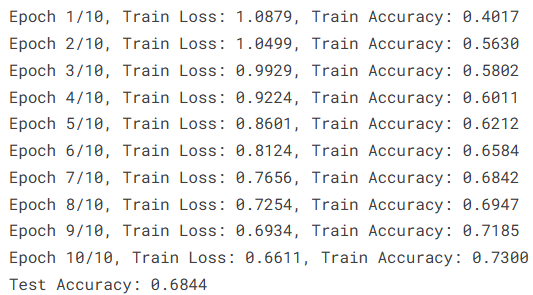 print(f"Epoch {epoch+1}/{NUM_EPOCHS}, Train Loss: {epoch_loss:.4f}, Train Accuracy: {epoch_accuracy:.4f}")