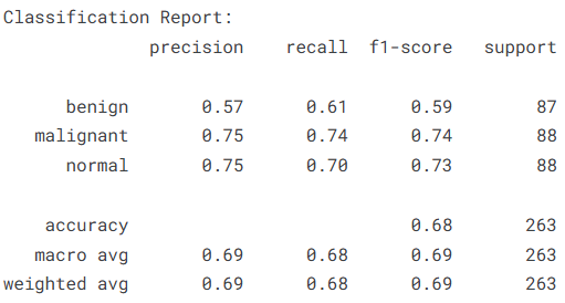 本实验基于Kaggle公开的乳腺超声图像数据集,构建了一个结合Vision Transformer(ViT)与图神经网络(GNN)的乳腺超声图像分类模型,对正常、良性和恶性三类乳腺组织进行自动识别。实验过程中首先对数据集进行了整理与类别均衡处理,并完成了图像预处理与标准化操作,在此基础上利用ViT提取图像的深层视觉特征,再通过GNN对图像patch之间的结构关系进行建模,从而实现图像特征的进一步融合与表达。实验结果表明,该模型在测试集上取得了68.44%的整体分类准确率,其中恶性与正常样本的识别效果相对较好,而良性样本的识别性能略低。从分类报告可以看出,各类别的F1值整体维持在0.59至0.74之间,说明模型已经能够在一定程度上捕捉乳腺超声图像中的关键特征,但仍存在一定的提升空间。总体来看,ViT与GNN结合的建模思路在乳腺超声图像分类任务中具有一定可行性,为医学影像智能分析提供了一种新的研究思路,但在模型结构优化、数据规模扩展以及特征表达能力等方面仍有进一步改进的空间。