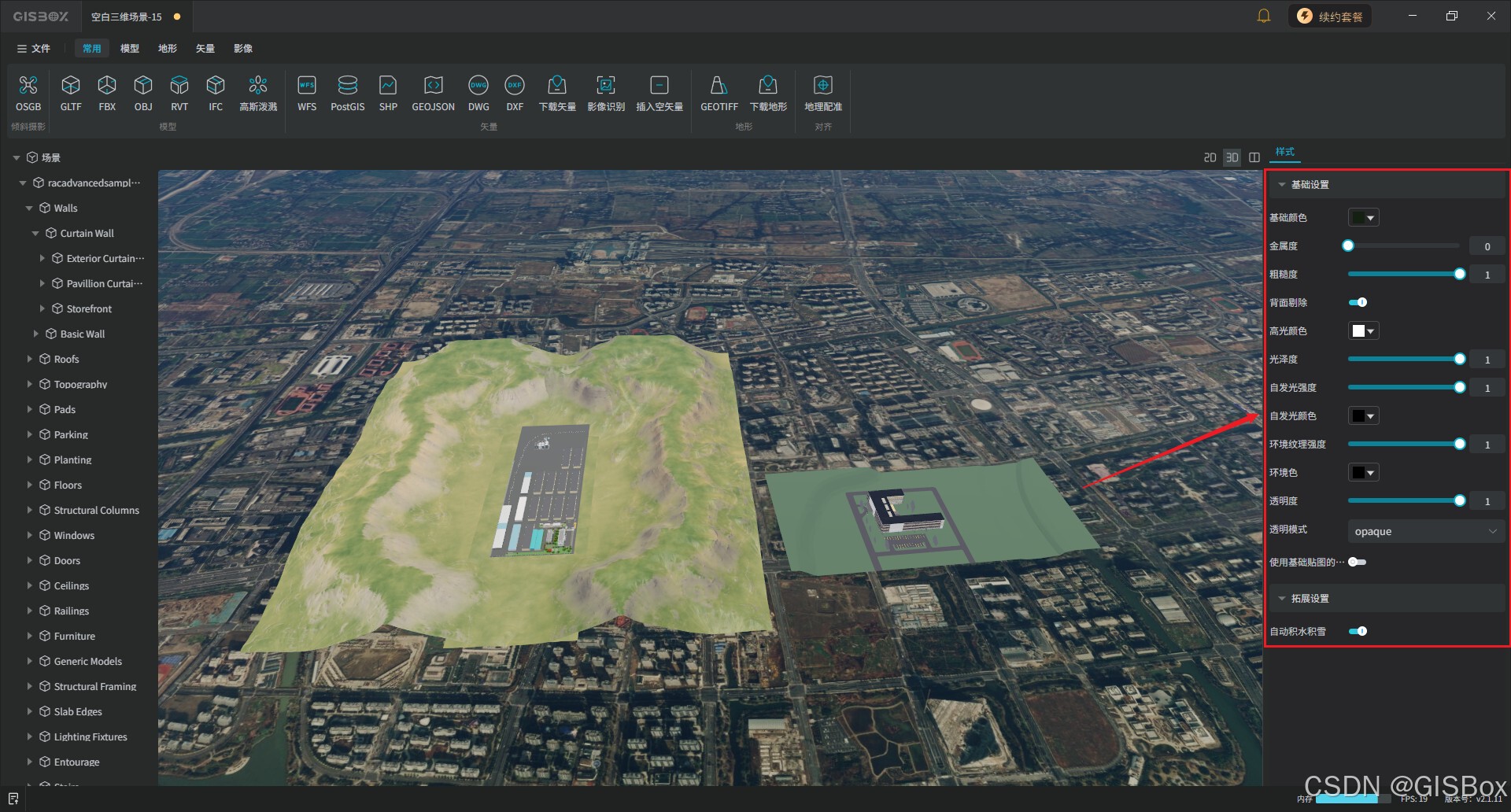 3、模型导入完成后,在右侧的图层显示栏中点击任意目标模型,即可在右侧样式编辑面板中对模型进行个性化参数调整。可按需修改模型的颜色、金属度、光泽度及透明度等核心视觉属性,通过精准的参数设置,让模型呈现效果贴合项目整体设计风格,满足不同场景的视觉呈现需求。