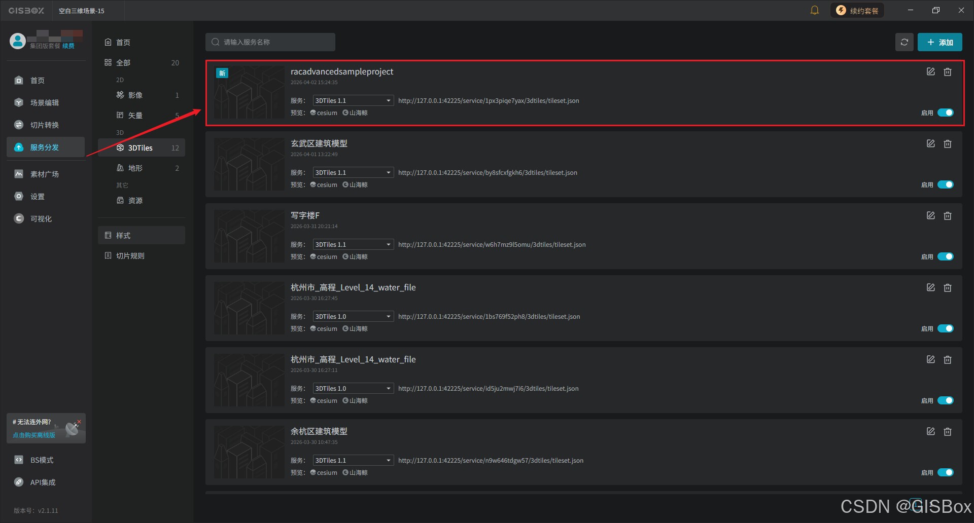 3、合并导出的模型会在切片处理列表中进行转换。处理完成后,我们直接点击“前往服务”按钮。此时会看到模型合并导出后发布的3DTiles服务。