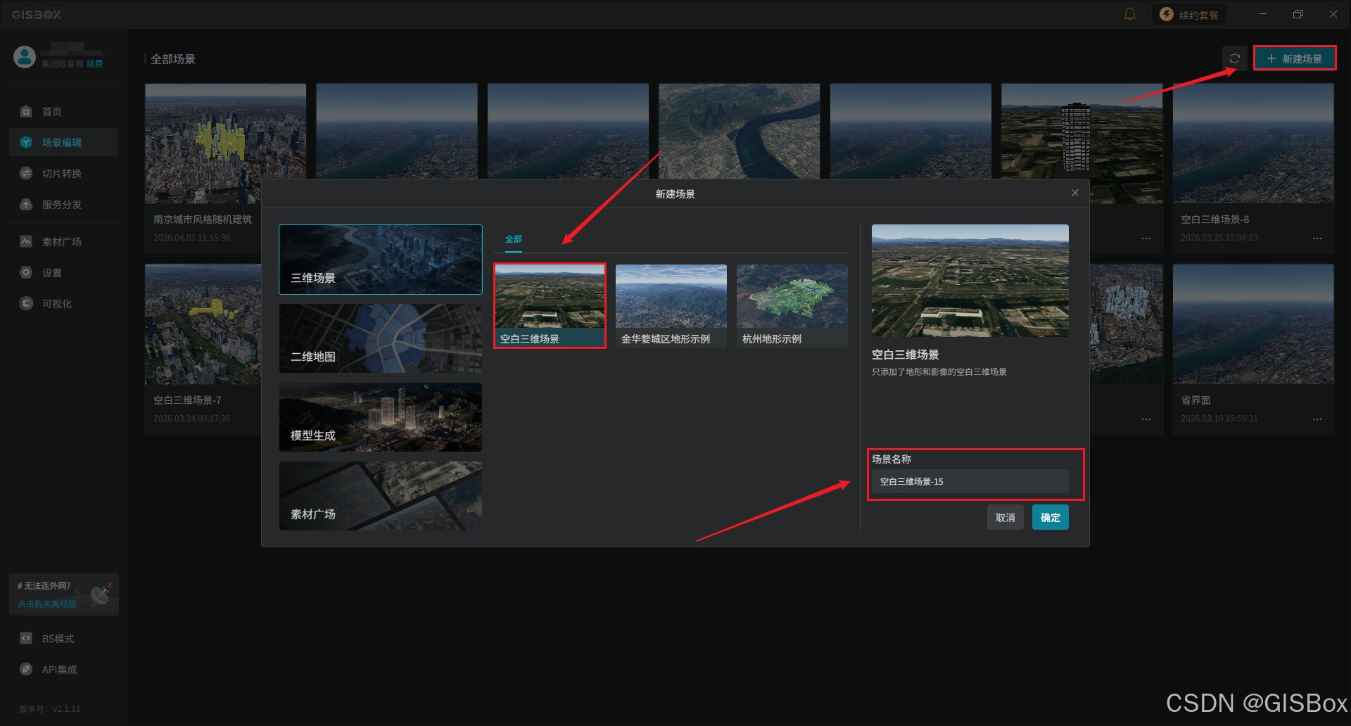 1、首先进入“场景编辑”模块,点击界面右上角的“新建场景”按钮,在弹出的创建弹窗中,选择空白三维场景选项,随后输入对应项目的名称,即可完成三维场景的基础创建,为后续模型导入与编辑搭建专属操作空间。