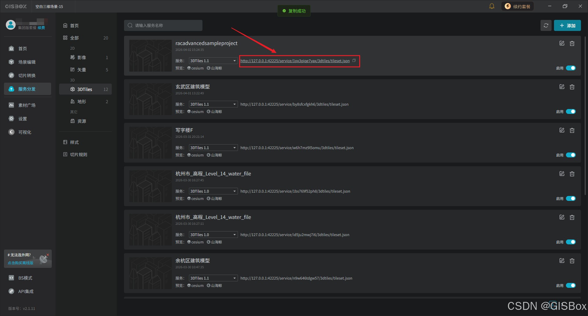 5、生成的服务地址也可以直接应用到其他的GIS平台或者数字孪生项目中。