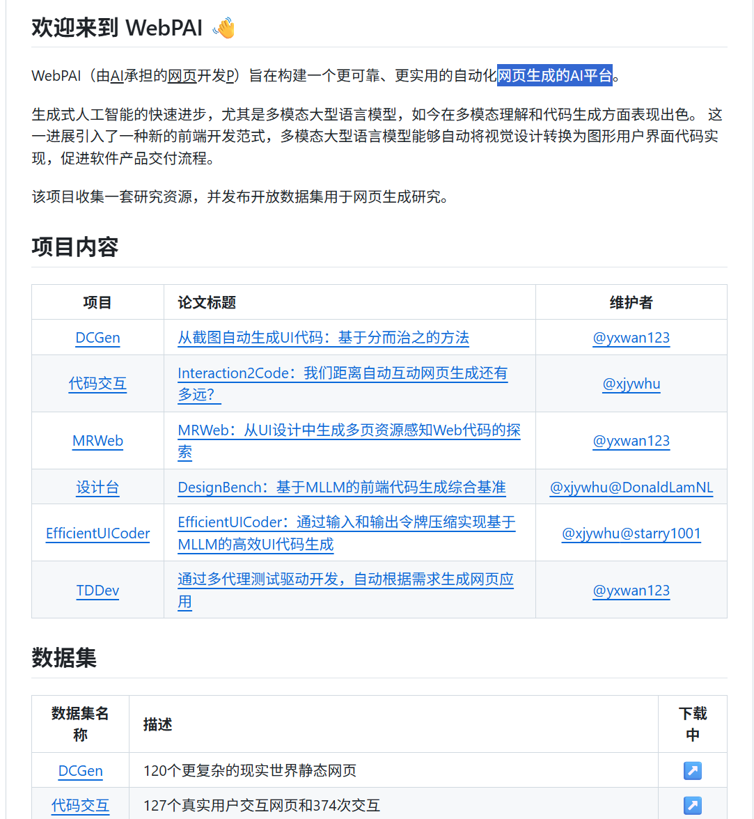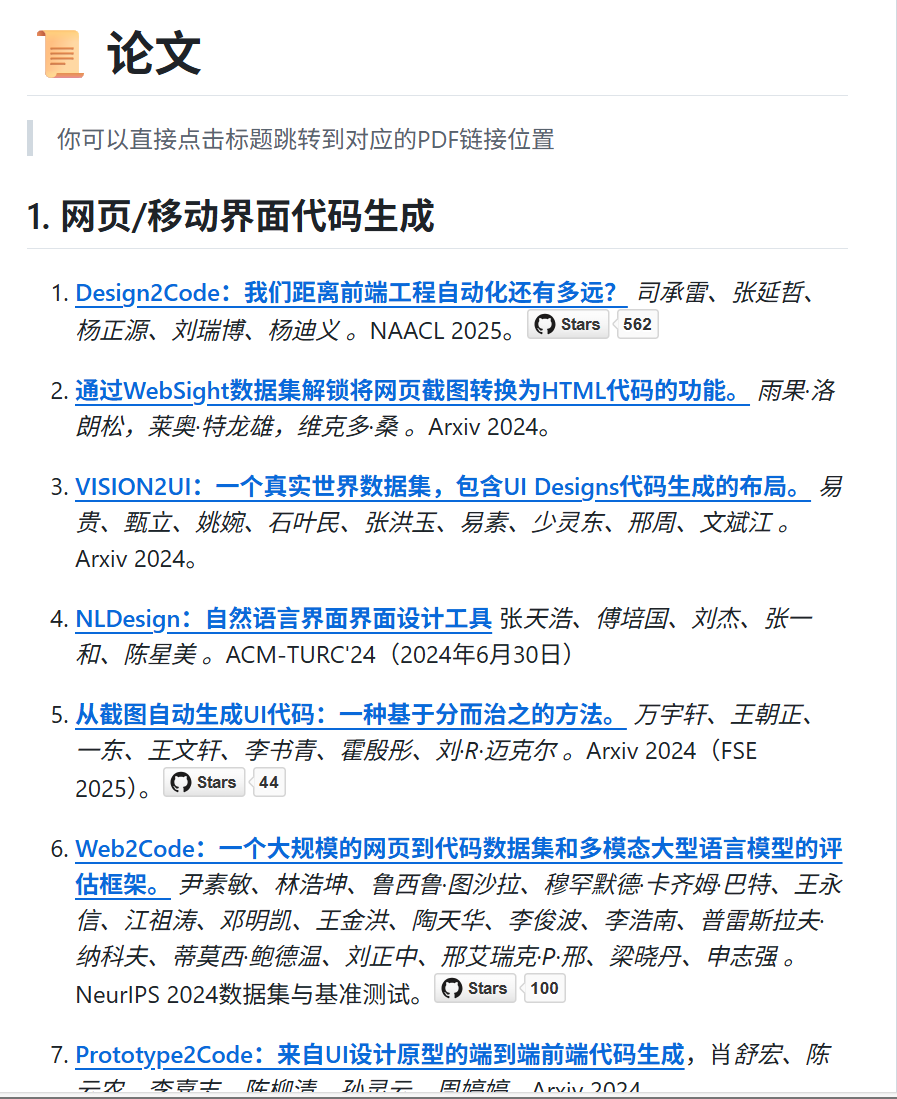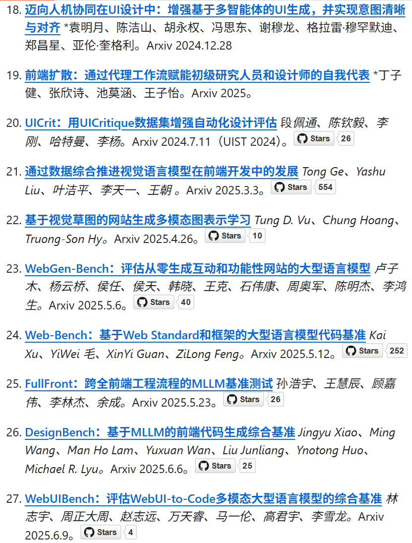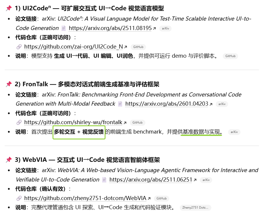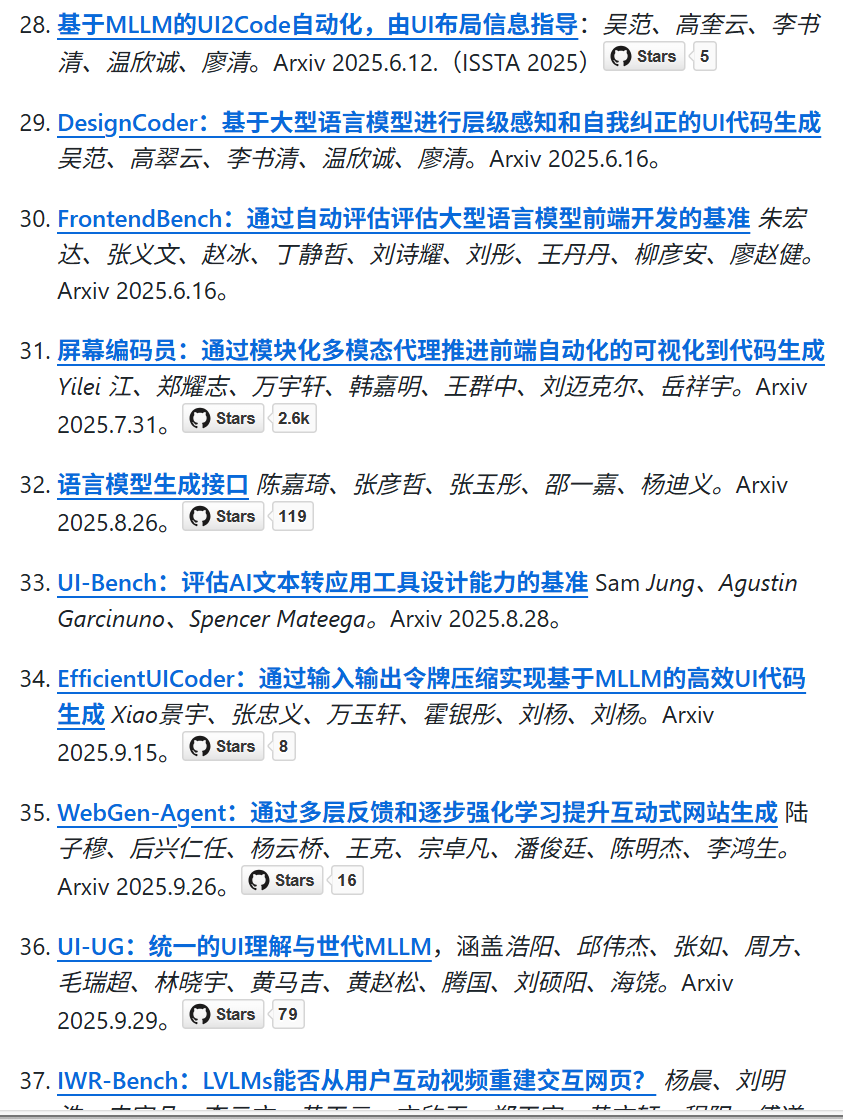 项目名 论文链接 最新代码仓库 UI2Codeⁿ https://arxiv.org/abs/2511.08195 https://github.com/zai-org/UI2Code_N FronTalk https://arxiv.org/abs/2601.04203 https://github.com/shirley-wu/frontalk WebVIA https://arxiv.org/abs/2511.06251 https://github.com/zheny2751-dotcom/WebVIA EfficientUICoder https://arxiv.org/abs/2509.12159 https://github.com/WebPAI/EfficientUICoder ScreenCoder https://arxiv.org/abs/2507.22827 https://github.com/leigest519/ScreenCoder