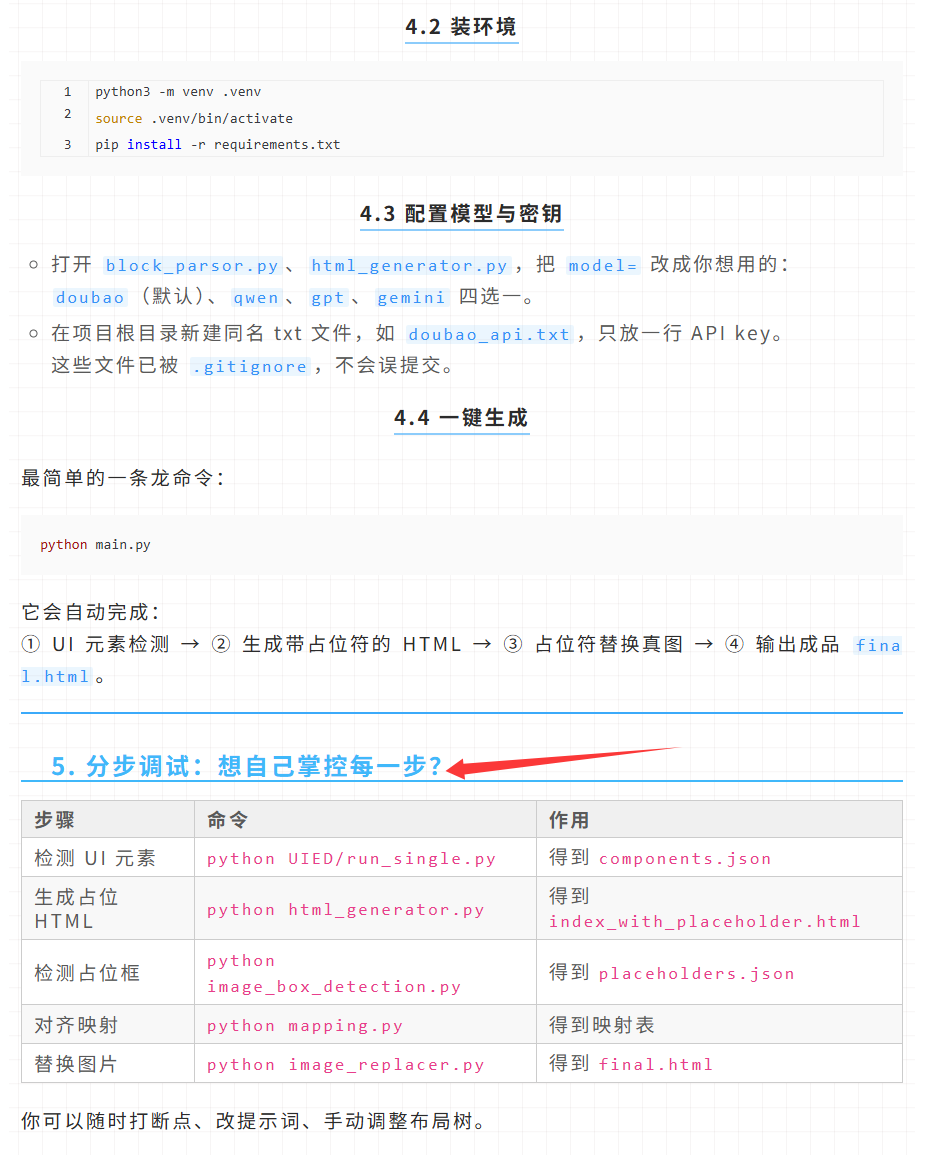 2. 安装:①克隆仓库 ②创建虚拟环境 ③安装依赖 ④配置模型和API密钥(doubao_api.txt)