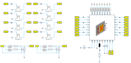 根据 Buck 电路的拓扑结构,在 CST 电路工作室中将各个所需的元器件模块连接在一起,如图十三所示,上下桥的 IGBT 和 diode,S 参数模型,滤波电容,驱动端电路,以及负载和电源等。