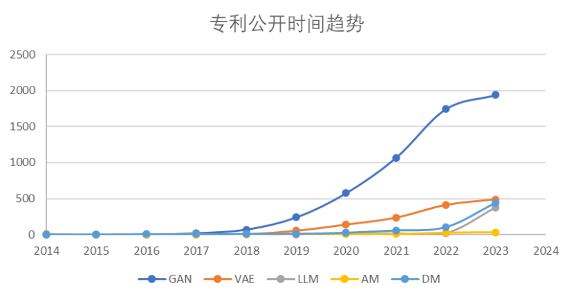 2014年至2023年间,GANs大模型的专利家族有9700个,仅2023年就有2400个专利家族公布。VAEs和LLMs的专利家族数量分列第二和第三位,2014年至2023年间分别拥有约1800和1300个新专利家族。