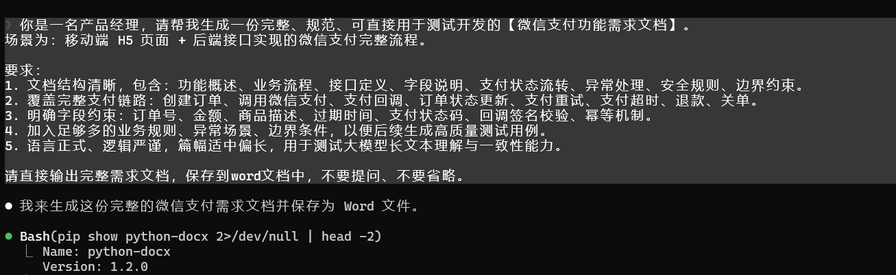 比如,此处我希望 GLM-5.1 帮我自动生成一份完整、规范、可用于测评的「微信支付场景需求文档」。