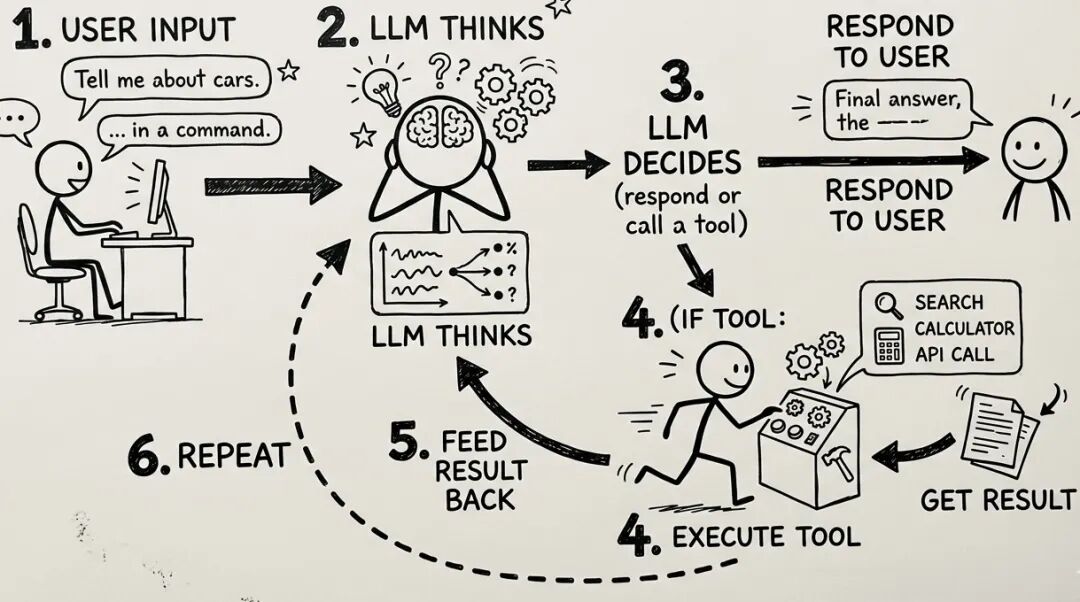 用户输入 → LLM 思考 → LLM 决定(回复还是调用工具)→ 如果调用工具:执行,把结果传回 → 重复