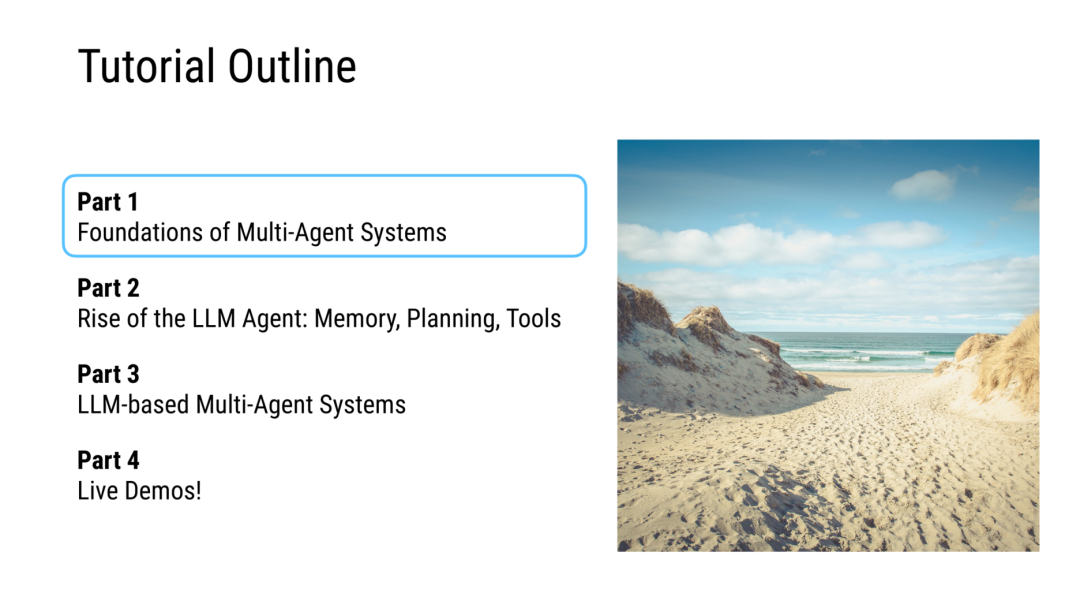 过去的多智能体系统(Multi-Agent Systems, MAS)研究,常见关键词是:博弈论、机制设计、多智能体规划与学习、协商与信誉、群体规范与涌现、沟通与协作、人机交互、对手建模、社会网络、仿真、以及形式化验证等。AAAI’26 的教程将这条“传统 MAS 主线”与近两年的“LLM 智能体(agent)浪潮”拼接在同一张路线图上:LLM 不只是生成文本,而是把自然语言理解/推理/规划/工具调用/记忆整合到一个可执行的“智能体控制器”里,进而让“多智能体协作”从学术设定走向工程工作流与产品化场景。[PDF p.3–6]