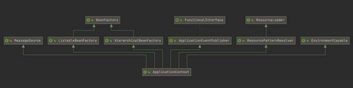 如上图,是Spring中ApplicationContext的继承体系,当你需要了解ApplicationContext的时候,可以先去熟悉一下它的父接口的作用,当你大致弄明白了每个接口的作用,那么ApplicationContext有啥作用就大致就清楚了。