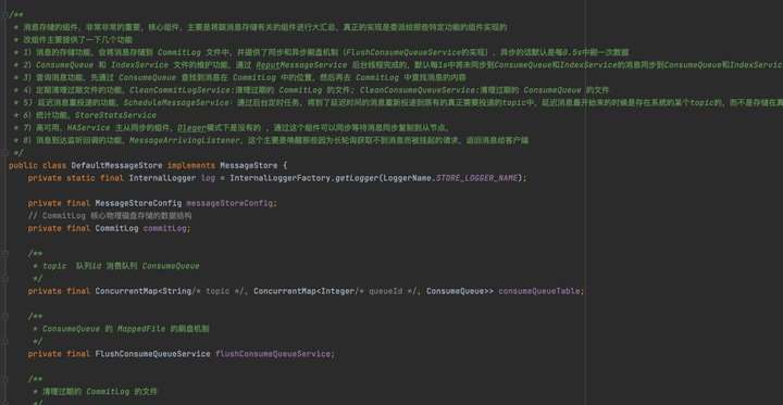 如图,是我读RocketMQ中对于DefaultMessageStore类阅读的注释,这个类是RocketMQ中一个非常核心的类,从名字可以看出来跟消息的存储有关。这个类的功能非常多,所以我写了很多注释,列举了这个类主要有哪些功能和这些功能实现的一些细节。