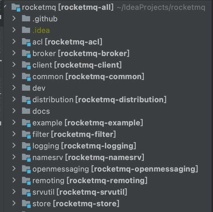 如上是RocketMQ源码,如果前面阅读过官网相关的一些概念介绍,就大致可以知道这些模块有什么功能。