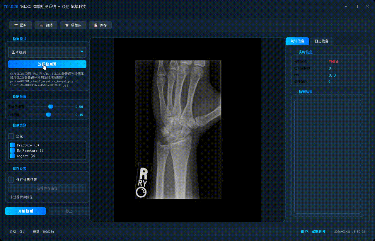 目标检测算法,特别是单阶段检测器YOLO系列,因其速度快、精度高,在工业和安防领域已取得显著成果。将其应用于医学影像的骨折识别,有望实现快速、自动化的初步筛查,辅助医生提高诊断效率。本研究旨在探索YOLO26模型在骨折检测任务中的可行性与性能表现。通过构建专门的骨折检测数据集,训练并评估模型的识别能力,分析当前模型的优劣势,为后续优化提供方向。我们的目标是开发一个能够有效区分骨折、非骨折及干扰物体的智能检测系统,为临床辅助诊断提供技术支持。