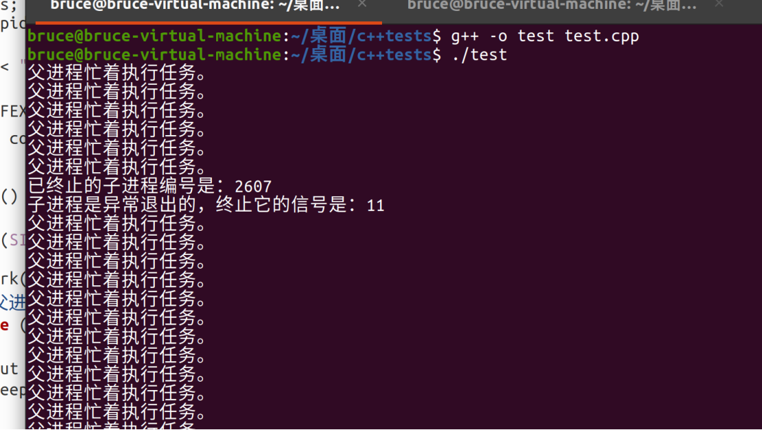 父进程是一个死循环,而子进程在运行5s之后异常退出(解引用空指针,出现段错误):