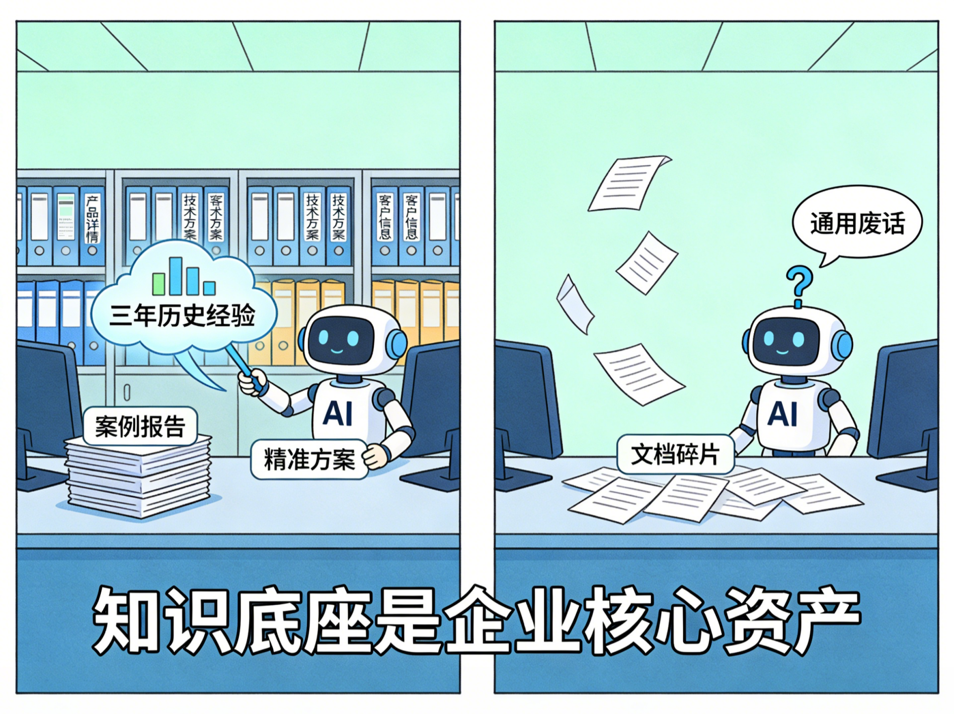 AI工具的能力上限不是由工具本身决定的,而是由企业知识底座的质量决定的。同样一个AI,知识底座完整的企业能调用三年历史经验秒速生成方案,而知识散落的企业AI只能生成通用废话。