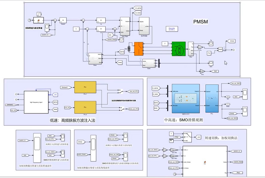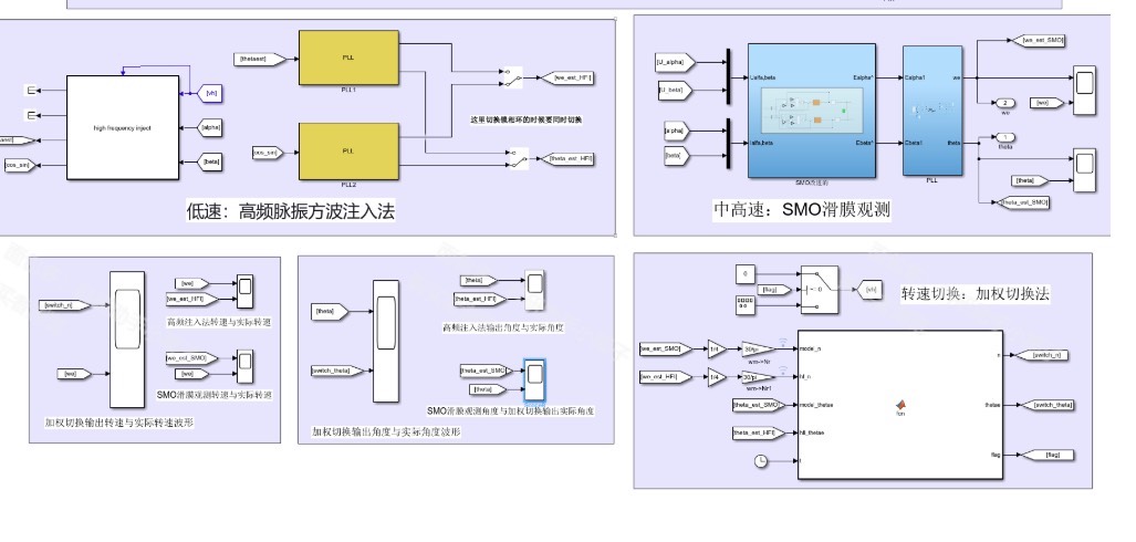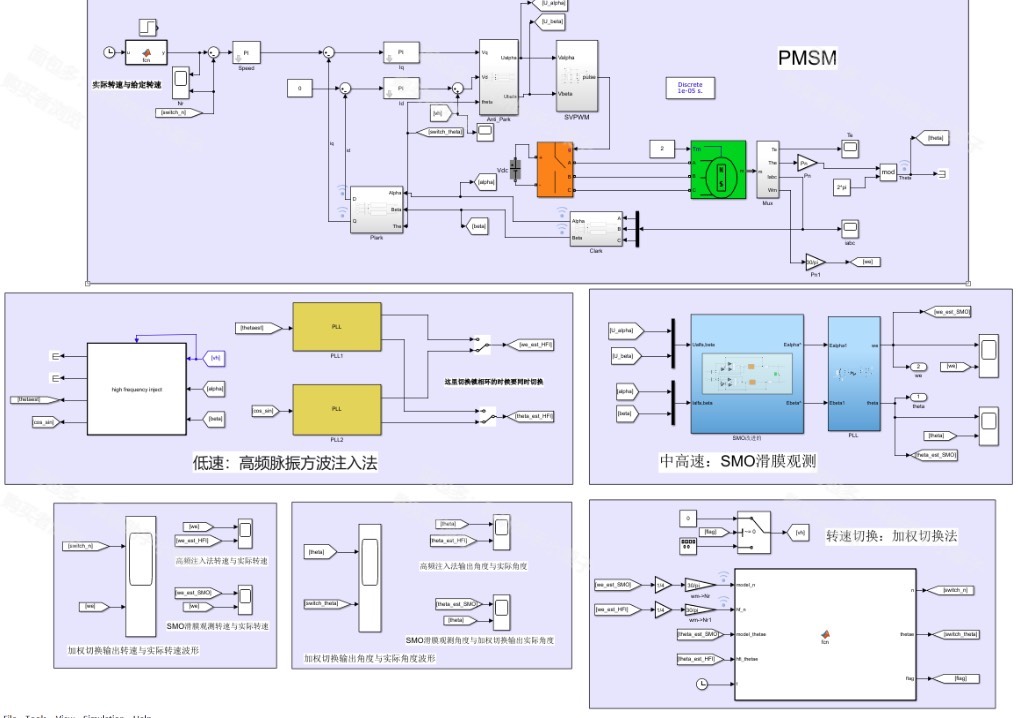 永磁同步电机全速域控制高频方波注入法、滑模观测器法SMO、加权切换矢量控制Simulink仿真模型 低速域采用高频方波注入法HF,高速域采用滑膜观测器法SMO,期间采用加权形式切 送前方法 1、零低速域,来用无数字滤波器高频方波注入法, 2.中高速域采用改进的SMO滑模观测器,来用的是sigmoid函数,PLL锁相环 3、转速过渡区域采用加权切换法 该仿真各个部分清晰分明,仿真波形效果良好内附详细控制方法资料论文 带有参考文献和说明文档,仿真模型