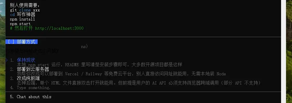 主要就三层:后端用Express服务入口,负责启动服务器、加载中间件和挂载路由;前端用原生HTML+JS,加载速度快,开发成本低;styles风格系统,是一个外部挂载,支持用户自己编辑、创建“风格.txt”来微调AI的写作风格。