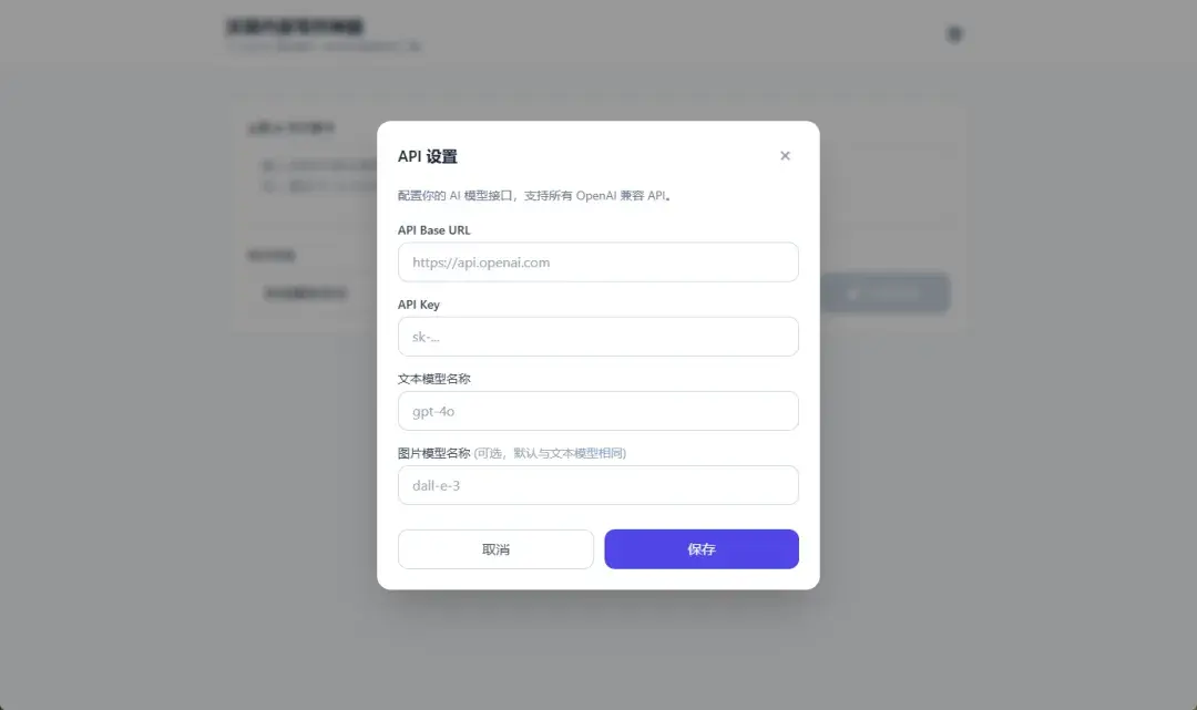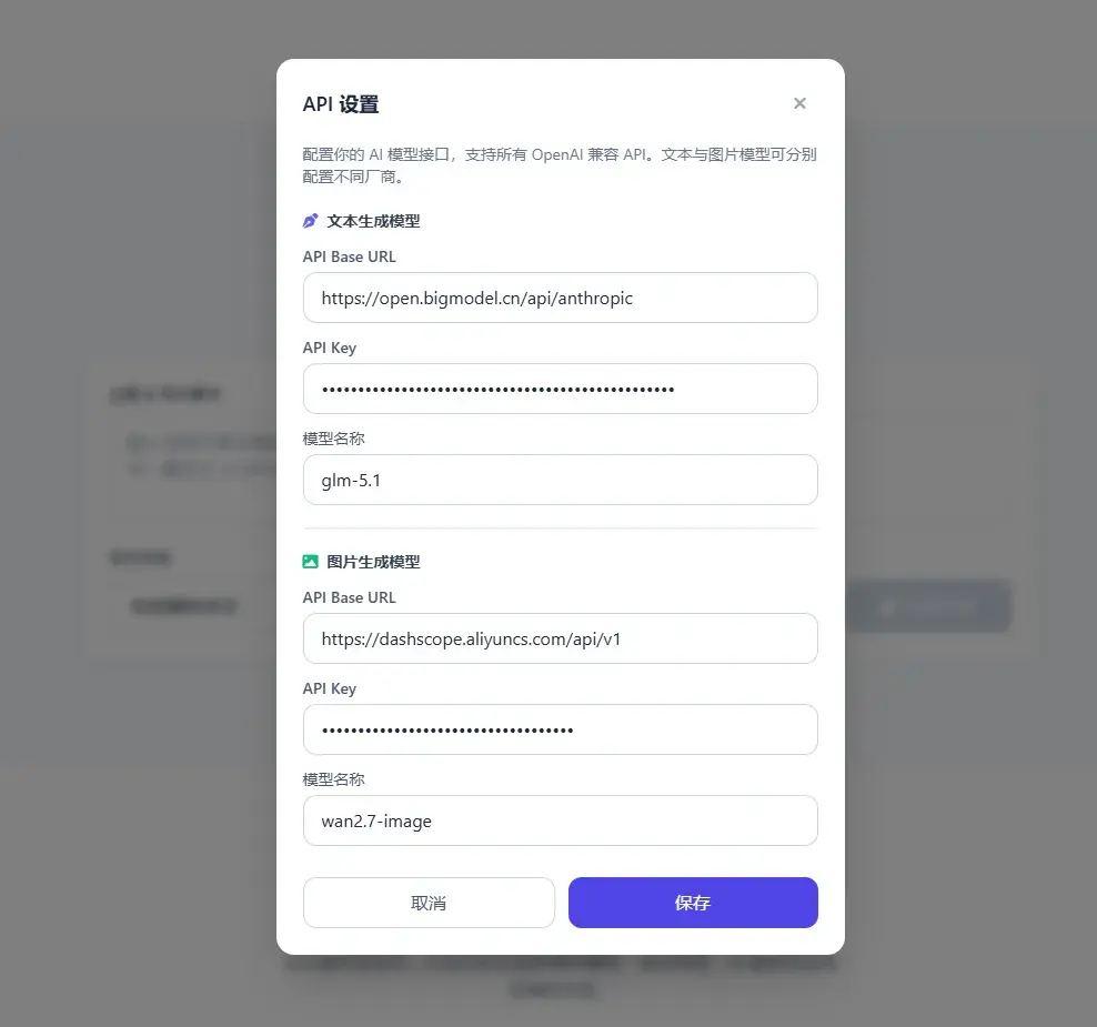 5、写作和生图均支持用户自行调用大模型。调用接口设计成可视化窗口,用户只需要输入模型url、模型key和模型名字,就可以使用。