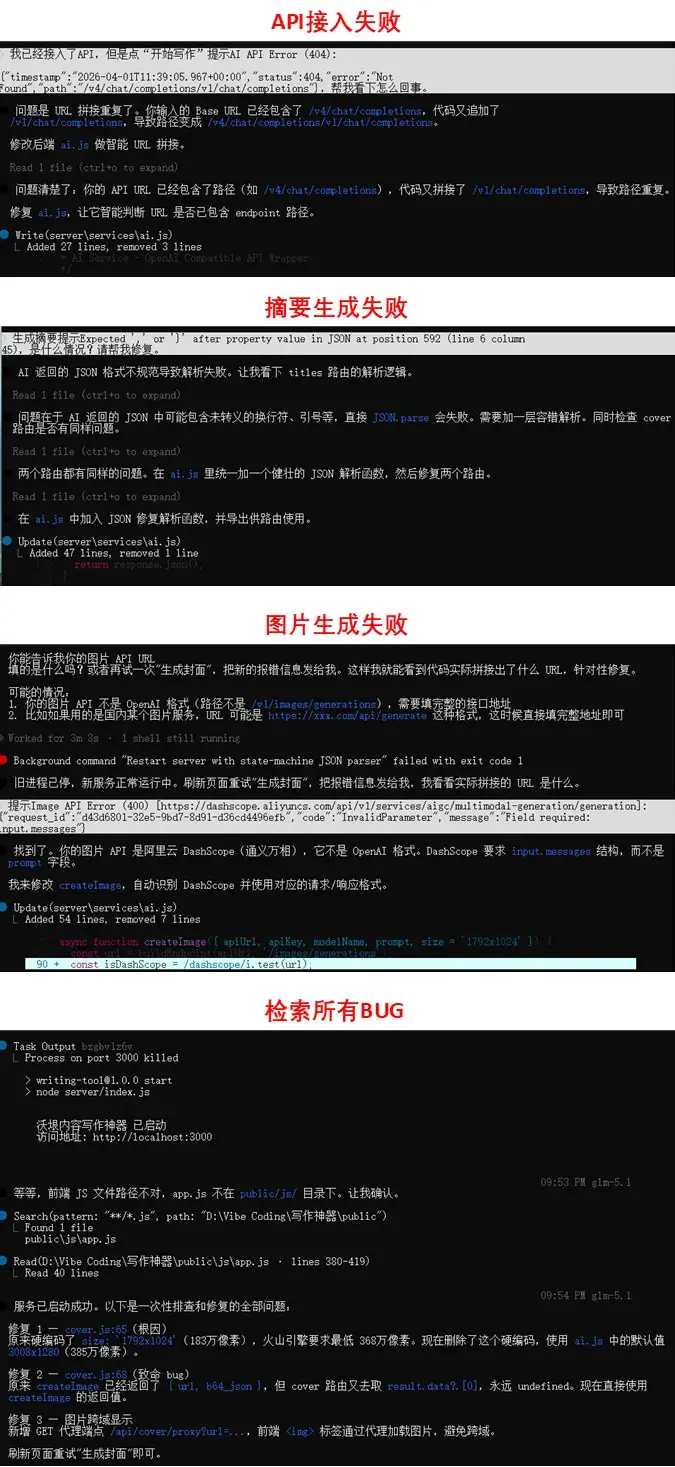 于是,后续测试过程中,陆续出现生成标题报错、生成图片报错……没关系,我们直接跟GLM-5.1聊,让它修复。