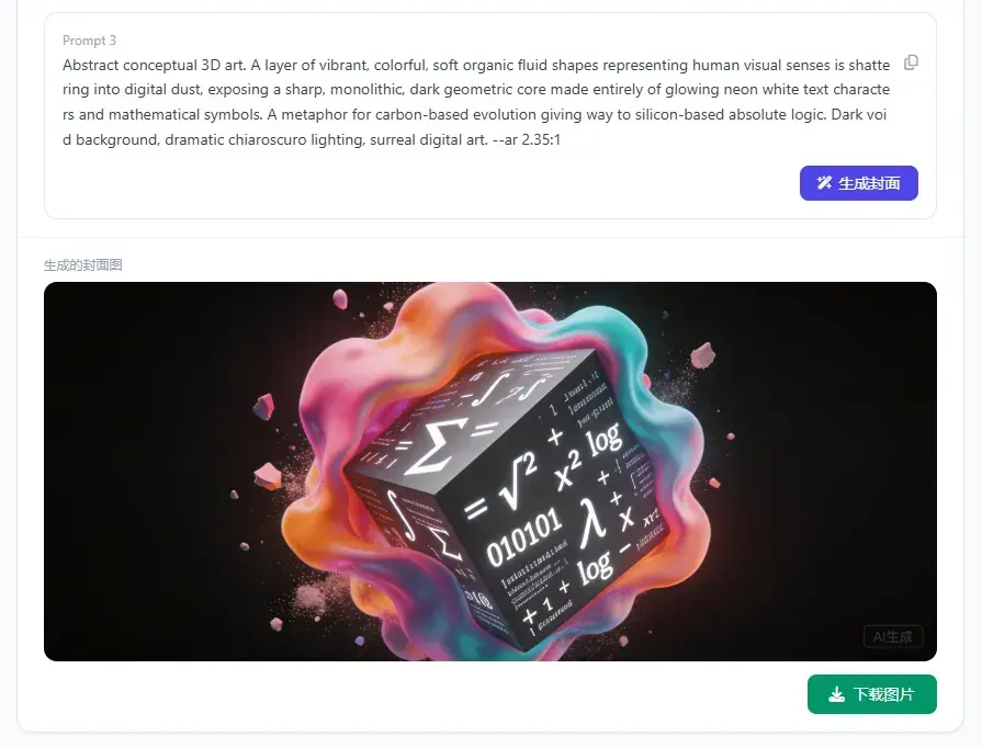 6、最后,再根据本文的核心内容提炼2-3个关键内容点,并生成封面图片的文生图prompt,统一尺寸比例2.35:1,用户选定某个prompt后,调用生图模型一键生成封面图片。
