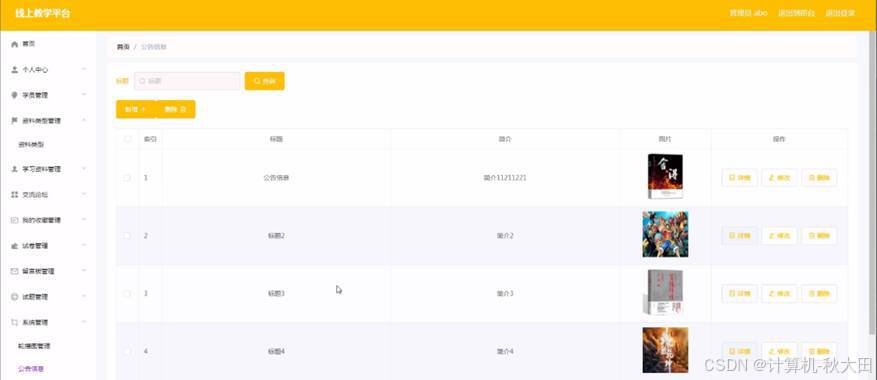公告信息,在公告信息页面中可以查看标题、简介、图片等内容,并且根据需要对已有公告信息进行详情,修改或删除等详细操作,如图4-11所示。