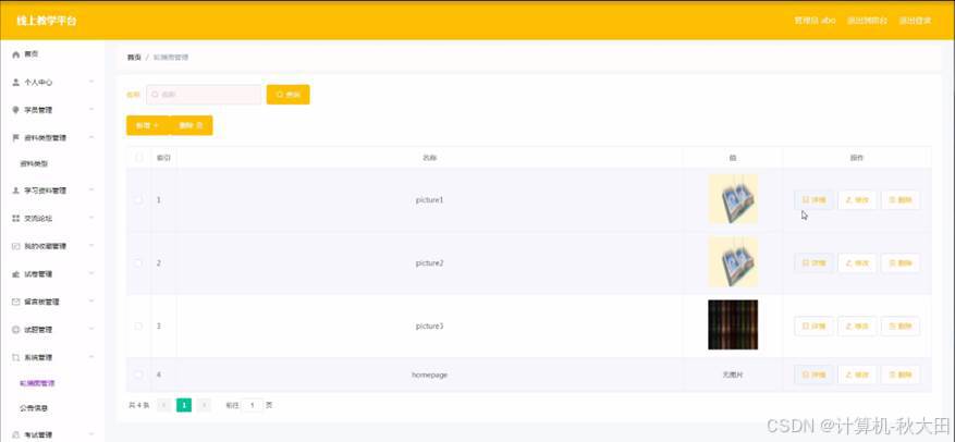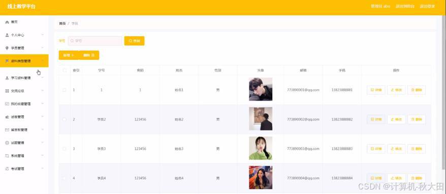 学员管理,在学员管理页面中可以通过填写学号、密码、姓名、性别、头像、邮箱、手机等内容进行详情、修改、删除,如图4-2所示。还可以根据需要对资料类型管理进行详情,修改或删除等详细操作,如图4-3所示。