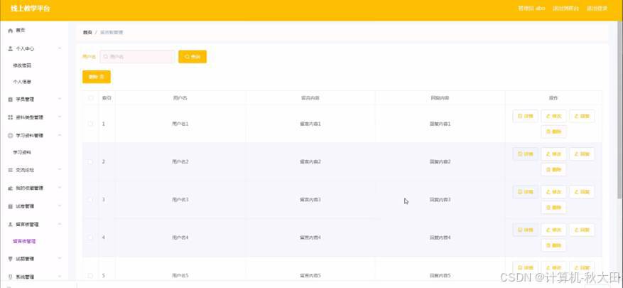 学习资料评论,在学习资料评论页面中可以查看评论内容、回复内容等内容,并且根据需要对已有学习资料评论进行详情,修改或删除等详细操作,如图4-10所示。