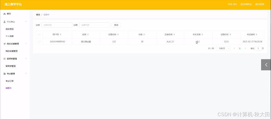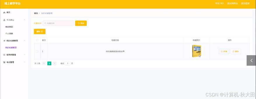 网上线上教学平台从本质上讲是一个电子商务模式综合而成的系统。实现了首页、个人中心、学员管理、资料类型管理、学习资料管理、交流论坛、我的收藏管理、试卷管理、留言板管理、试题管理、系统管理、考试管理等基本功能。
