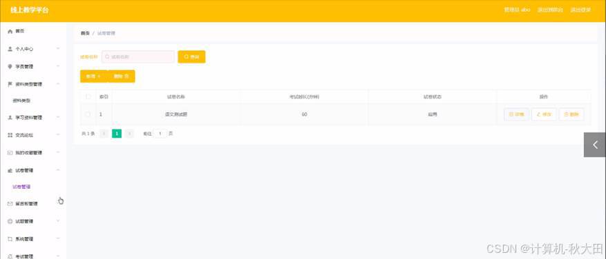 试题管理,在试题管理页面中可以查看试卷、试题名称、分值、答案、类型等内容,并且根据需要对已有试题管理进行详情,修改或删除等详细操作,如图4-7所示。