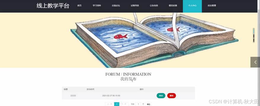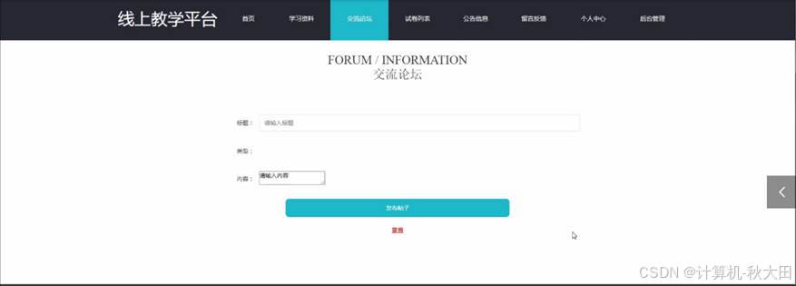线上教学平台,通过系统可以获取首页、学习资料、交流论坛、试卷列表、公告信息、留言反馈、个人中心、后台管理等信息操作内容,如图4-13所示。