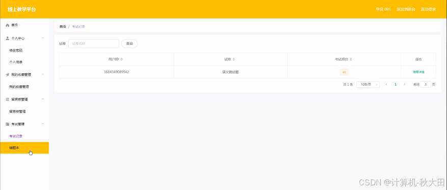 考试记录:通过列表可以获取用户ID、试卷、考试得分等信息,进行详情、删除操作,如图4-23所示。