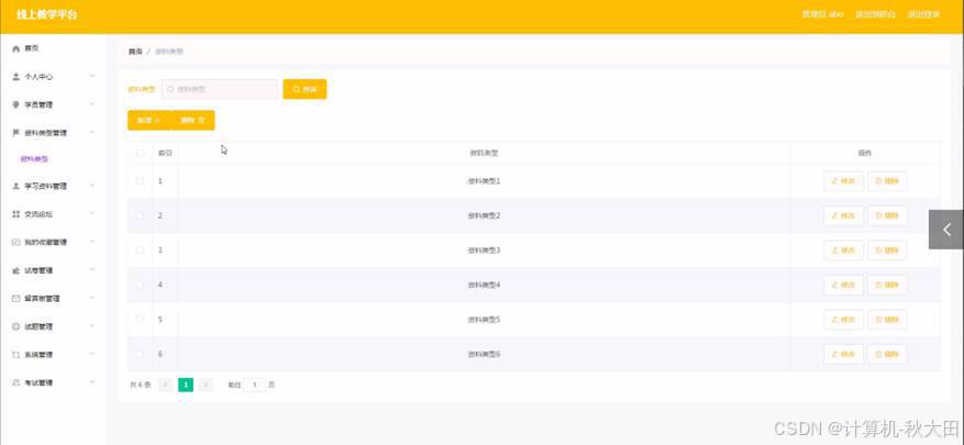 管理员登录进入线上教学平台可以查看首页、个人中心、学员管理、资料类型管理、学习资料管理、交流论坛、我的收藏管理、试卷管理、留言板管理、试题管理、