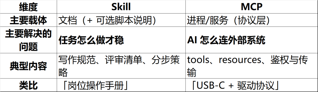 - 都要:既要有稳定外部接入(MCP),又要有可控工作流(Skill)。