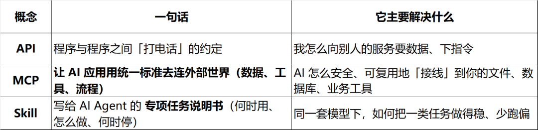把这三层分清楚,你就不会在「到底该学哪个」里迷路:该补协议就补 API,该补集成就补 MCP,该补流程就补 Skill——常常三者都要,只是主菜不同。