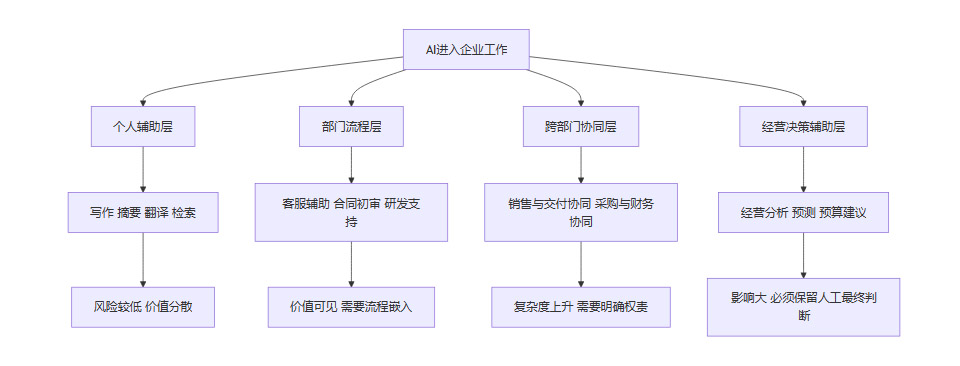 一旦AI开始稳定参与工作,它就不再只是一个可选工具,而会逐步改变任务分配、流程路径、审核关系和岗位价值。员工会发现,原本需要花半天完成的整理和初稿工作,现在几十分钟就能完成。管理者会发现,过去依赖少数经验员工承担的知识检索和内容整合,开始被系统化替代。中后台会发现,原来并不显性的风险,因AI输出被加速放大后变得更敏感。所有这些变化叠加在一起,最后影响的并不是一个工具是否好用,而是企业如何定义工作。