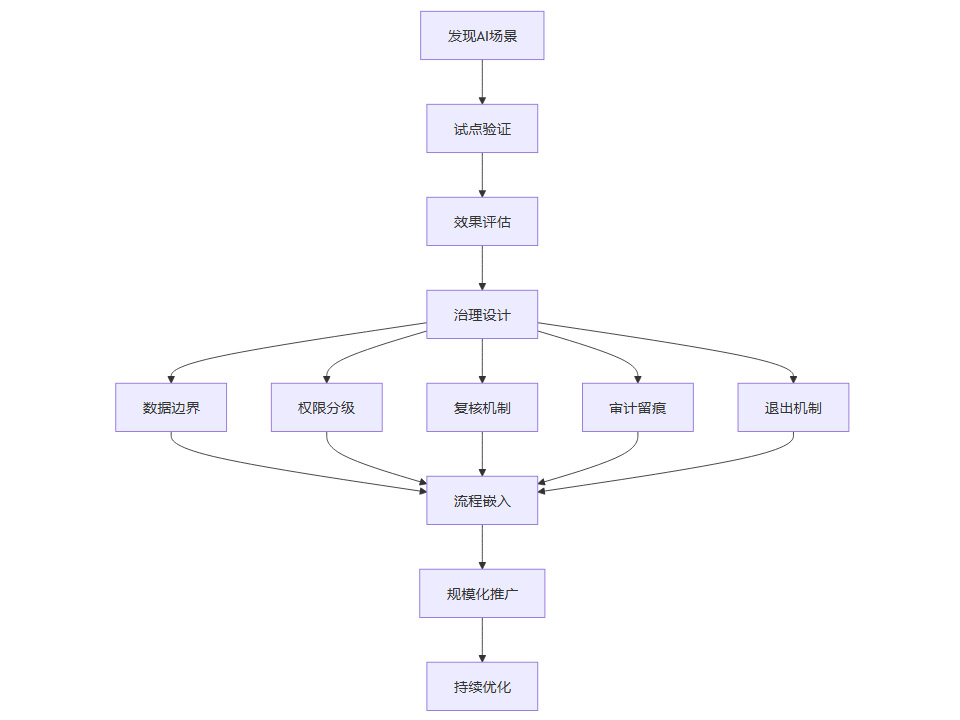很多企业的问题就在于,把D这一层直接跳过了。试点效果一出来,马上想复制推广,结果一接入核心流程,问题开始集中暴露。没有治理的AI应用,不是效率工具,而是责任风险的放大器。