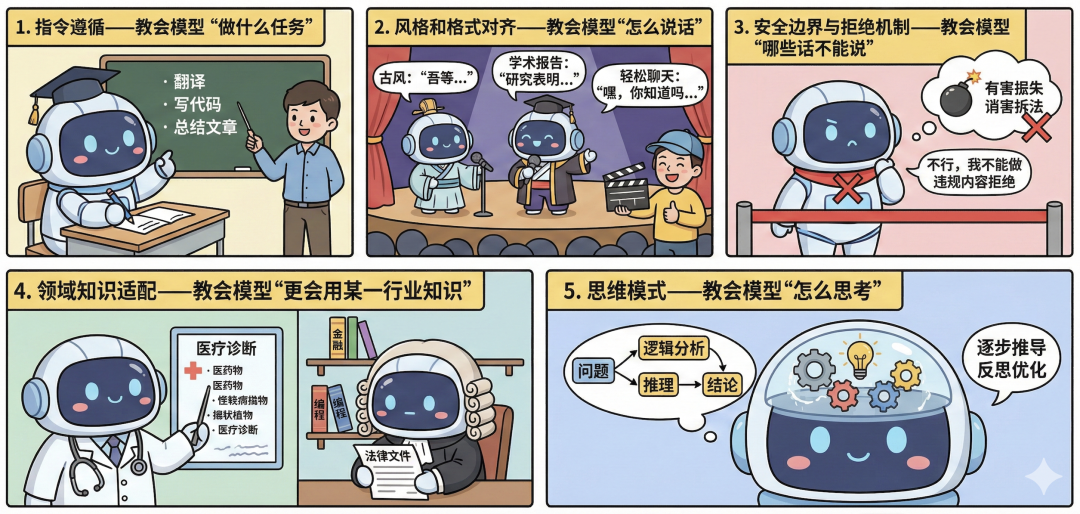 指令遵循——教会模型“做什么任务“:前面已经提到,这是SFT最直接的作用,它让模型理解“翻译”、“总结”背后的意图,建立“指令->行为”的映射关系。