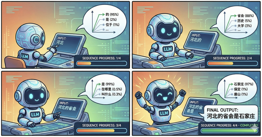 例如,当你输入“河北的省会是哪里?”时,Base Model可能会续写“…石家庄”,因为在预训练语料中,“河北”、“省会”、“石家庄”这几个词在很多的上下文序列中紧密相连。但这没完,它也可能会续写“…市区的天气”,甚至可能生成一段关于石家庄历史的百科。