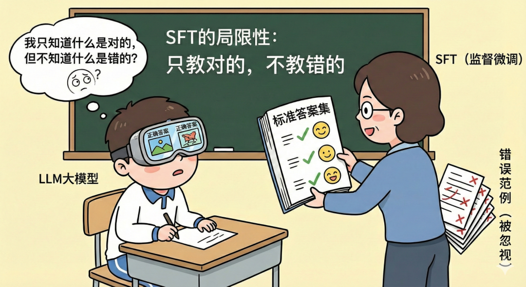 SFT最大的问题在于缺乏负反馈,它只告诉了模型“什么是对的”,却没有告诉它“什么是错的”。这源于训练集中本身就只有正确答案,SFT损失函数也只关注如何让模型逼近正确答案。如果标注数据中存在细微的逻辑错误,模型也会不加甄别地全盘吸收。