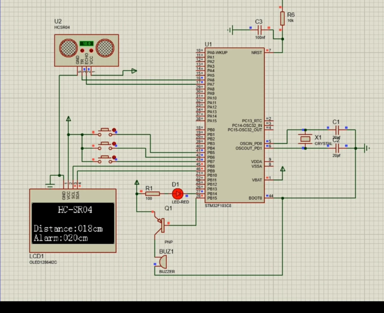 最近鼓捣了个小项目,用STM32做了个超声波测距报警,带OLED显示和按键调节,Proteus仿真跑起来还挺流畅,顺手把代码和设计思路整理了下,给想入门的小伙伴参考~