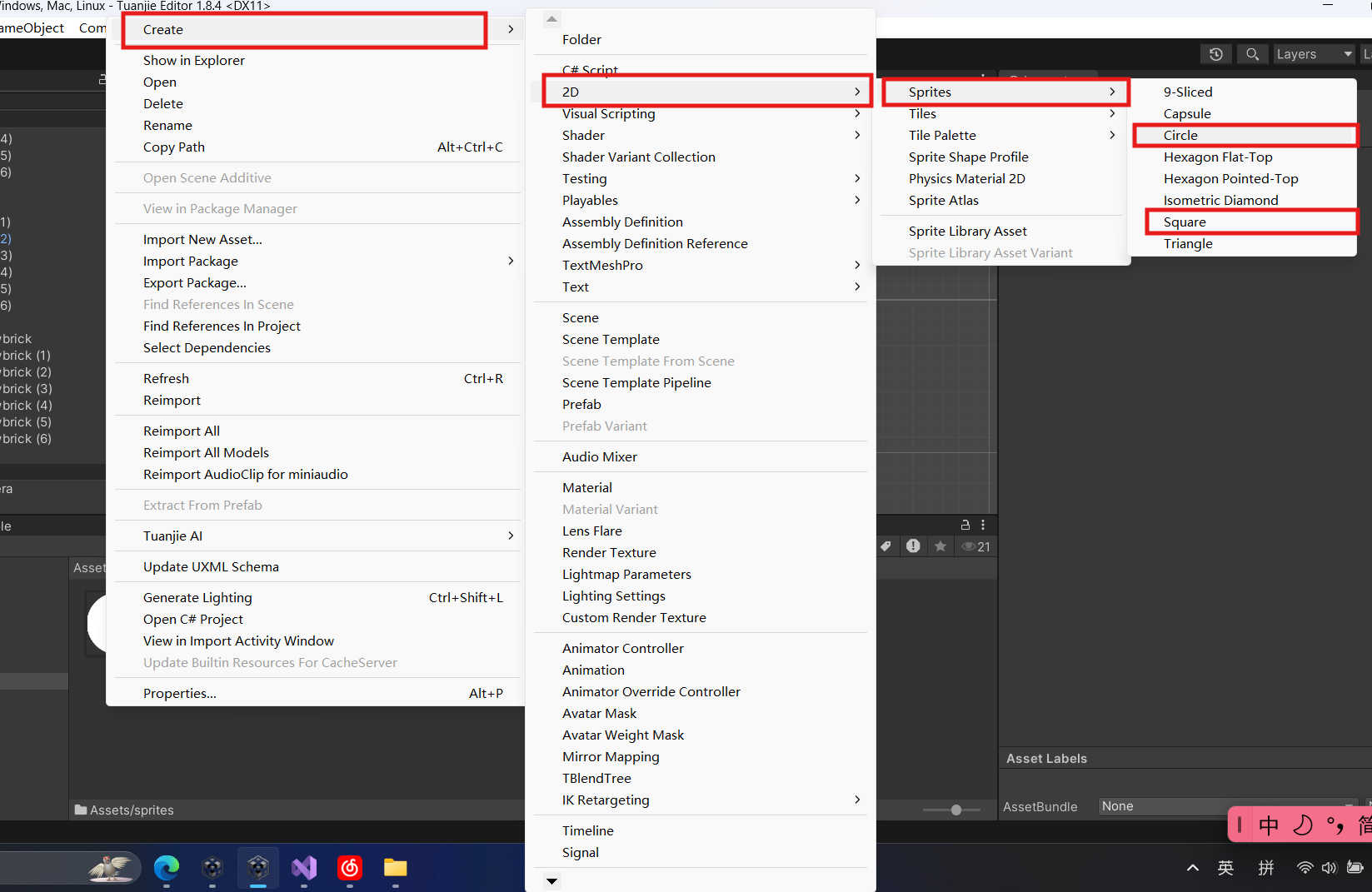 然后既然有了场景 那我自然要放入各种物体。unity自带2D 模型便有Circle(圆)和Square(方块)我们可以通过这两个来制作球和球拍 ,但是brick(砖块)我们不用此方法制作 后续会解释原因(这便是我制作遇到的第一个坑)。