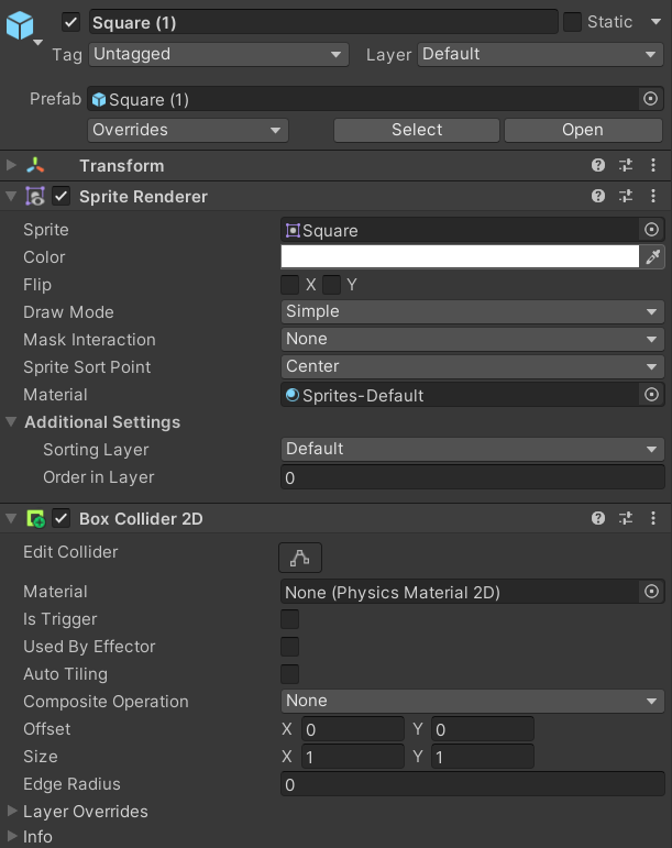 Box Collider 2D 是 Unity 中用于 2D 物理系统的一个组件。它的形状是一个矩形,并且在精灵的局部坐标空间中具有定义的位置、宽度和高度。矩形为轴对齐,即矩形的边与局部空间的 X 或 Y 轴平行。